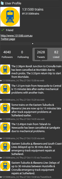 As a regular Sydney rail commuter (on CityRail’s Southern Highlands line) I’ve been following 131500 trains on Twitter for some time. It’s a really useful service – giving Twitter followers advance notice of issues and delays on the Sydney rail network.