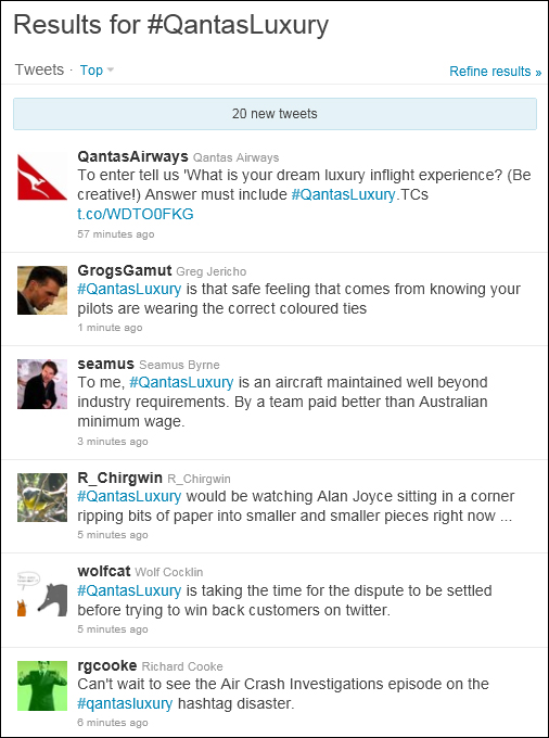 Unfortunately, this is all happening at a time when the Qantas brand and reputation is really at rock-bottom in the Australian community. The last thing you should be doing is putting your brand in the hands of that community through a social media campaign like #qantasluxury.
