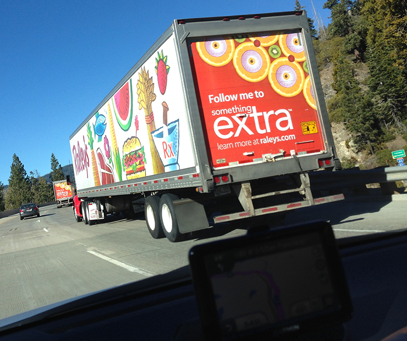 I passed a convoy of six or seven trucks travelling well below the speed limit, all identically kitted out in the branding of the supermarket chain Raley’s, promoting Raley’s reward card, Something Extra. It seemed to be a very effective way to promote a new product or service, especially when the trucks were probably transporting goods at the same time. Over here, I’ve always liked transport company Linfox’s ‘You are passing another Fox’ message on the back of all its trucks, but I’ve never seen this form of convoy advertising before.